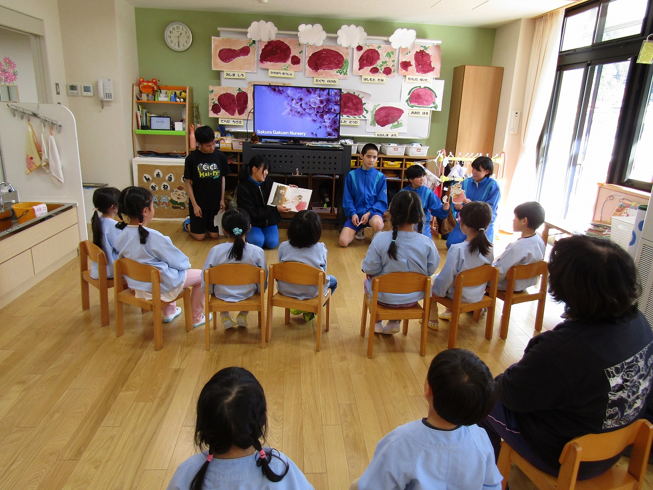11月18日(火)、8年生が英語の授業で保育園に出向き、園児の皆さんに英語の絵本の読み聞かせをしました。役割分担をして、ゆっくりていねいに読んだり、絵本の見せ方を工夫したり、ジェスチャーをしたりしながら、園児が楽しめるような読み聞かせをしました。園児のみなさんも笑顔で楽しんでいました。