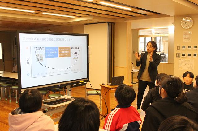 11月5日(水)に福本和哉さんを講師に招いて、「私たちの記憶のしくみ」について、5~9年生を対象に講話をしていただきました。記憶には短期記録と長期記憶があり、短期記憶を長期記憶に送るためには維持リハーサルが必要で、より記憶を高めていくためには精緻化リハーサルが有効であることを学びました。また、ゲームのように記憶のトレーニングも体験したので、これからの生活や学習に生かしていくことを願っています。