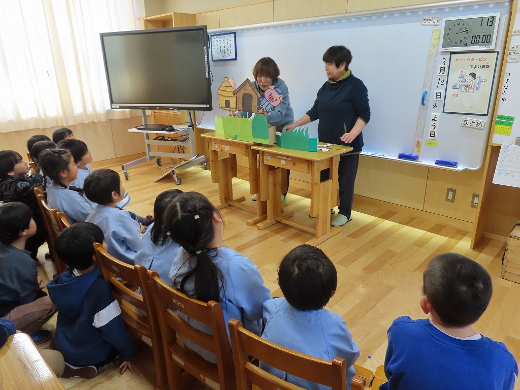 3月11日(水)、民生児童委員の牧下さんと山越さんに「読み聞かせ」をしていただきました。タイトルは「3匹のこぶた」でみんながよく知っているお話でした。今回は、1・2年生に加え、保育園児も参加しました。どの子も目を輝かせて、真剣な眼差しで読み聞かせに集中していました。いつもながら、ペープサートを使って子どもたちが楽しめるように準備をしてくださり、本当に感謝です。ありがとうございました。